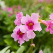 Produces trumpet-shaped pink flowers with lush green foliage